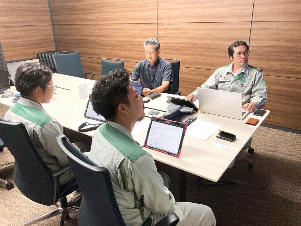 知念 隼人 様、知念 珠音 様、長嶺 力 様(建築工事部) 小渡 真一郎 様(業務改革推進室 室長)