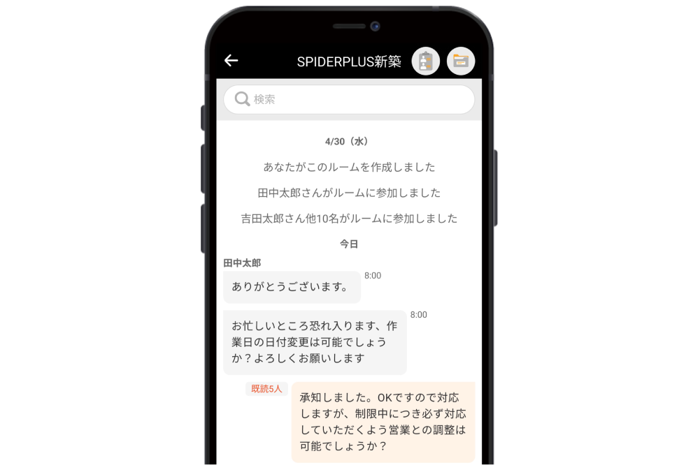 チャットにやり取りが残り、「言った言わない」を防ぎます。キーワード検索で過去の指示も検索可能。