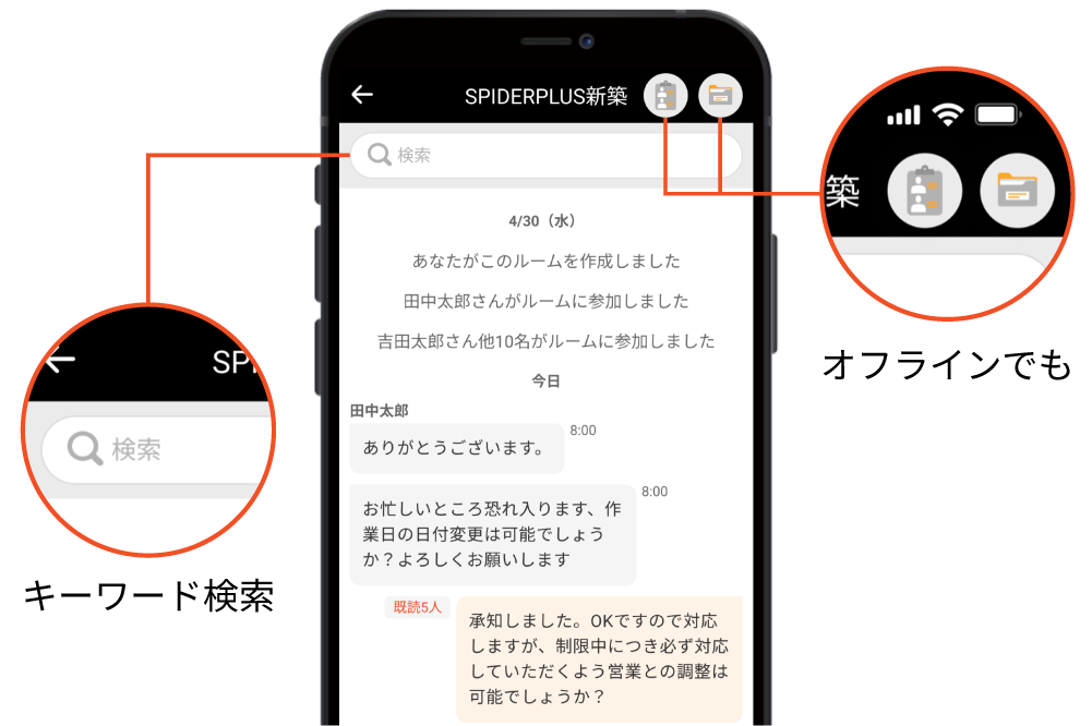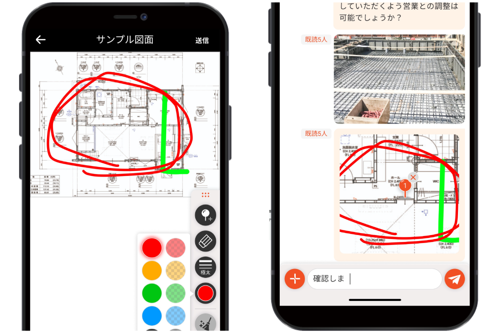 多様な機能既読者確認機能で伝達できているかチェックできて安心。図面にお絵描き&ピン留め機能で、説明の手間や
