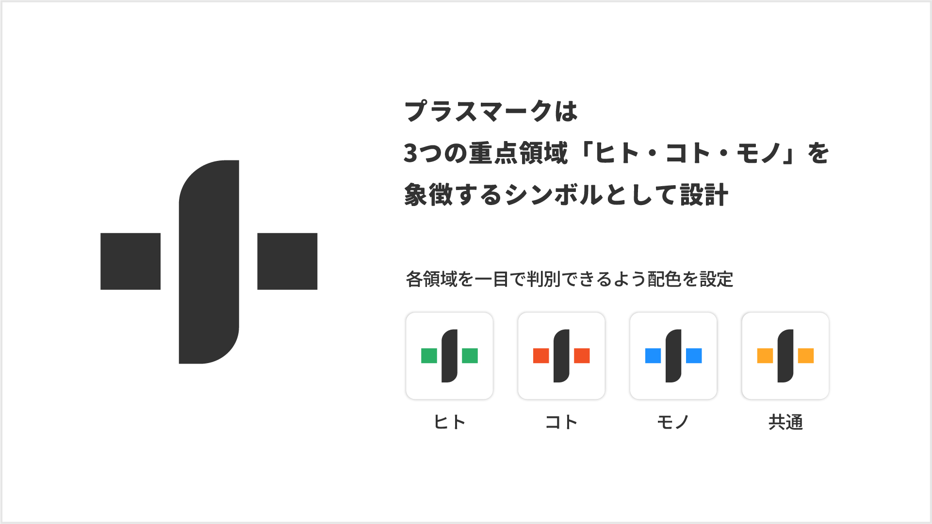 新しいロゴの中心となるプラスマークは「ヒト・コト・モノ」の3つの領域を象徴するシンボルとして設計し、各領域を視覚的に表すため、意図的に3つのパーツで構成いたしました。
